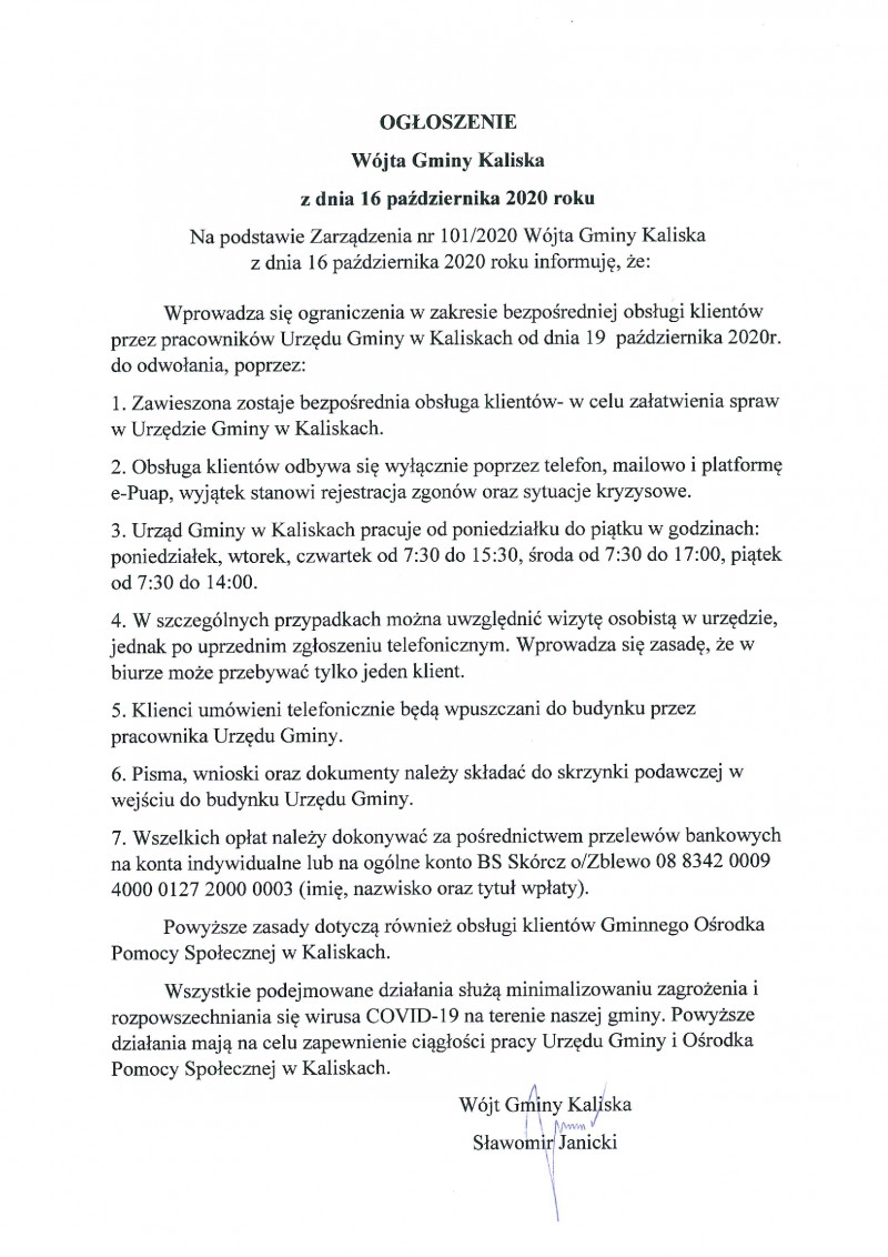 Zmiana organizacji pracy w Urzędzie Gminy od dnia 19 października 2020 r.