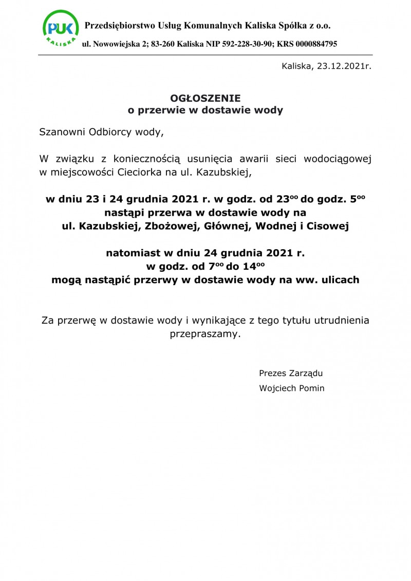 Budowa sieci kanalizacji sanitarnej, rozbudowa i przebudowa sieci wodociągowej dla miejscowości Cieciorka, Dąbrowa, Iwiczno wraz z rozbudową oczyszczalni ścieków w Kaliskach