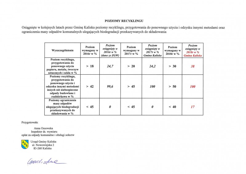 Osiągnięte w kolejnych latach przez Gminę Kaliska poziomy recyklingu, przygotowania do ponownego użycia i odzysku innymi metodami oraz ograniczenia masy odpadów komunalnych ulegających biodegradacji przekazywanych do składowania
