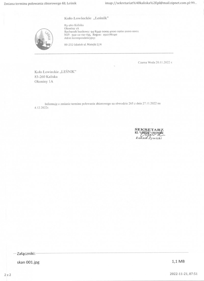 Informacja o zmianie terminu polowania zbiorowego Koła Łowieckiego „Leśnik”