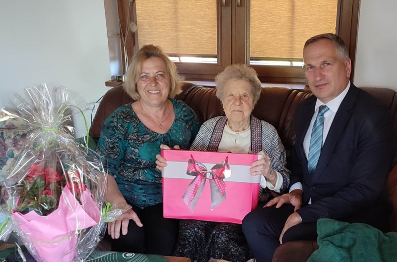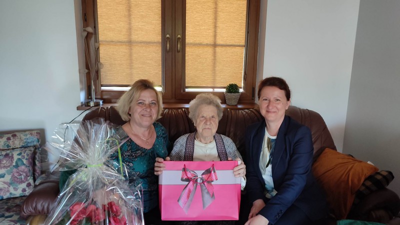 Uroczystość odbyła się w miejscu zamieszkania córki Barbary. Wójt w imieniu władz samorządowych wręczył Jubilatce upominek i kwiaty oraz złożył najserdeczniejsze życzenia.