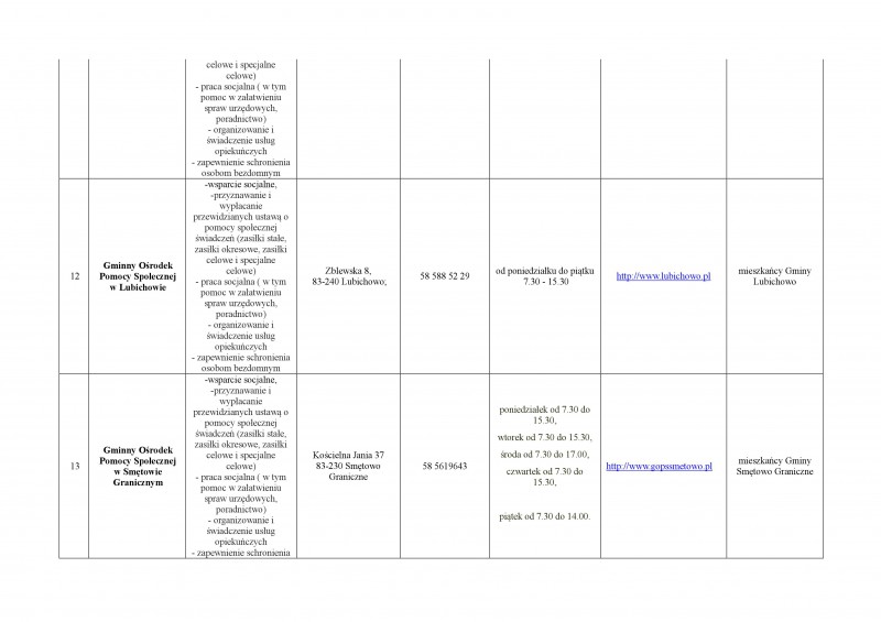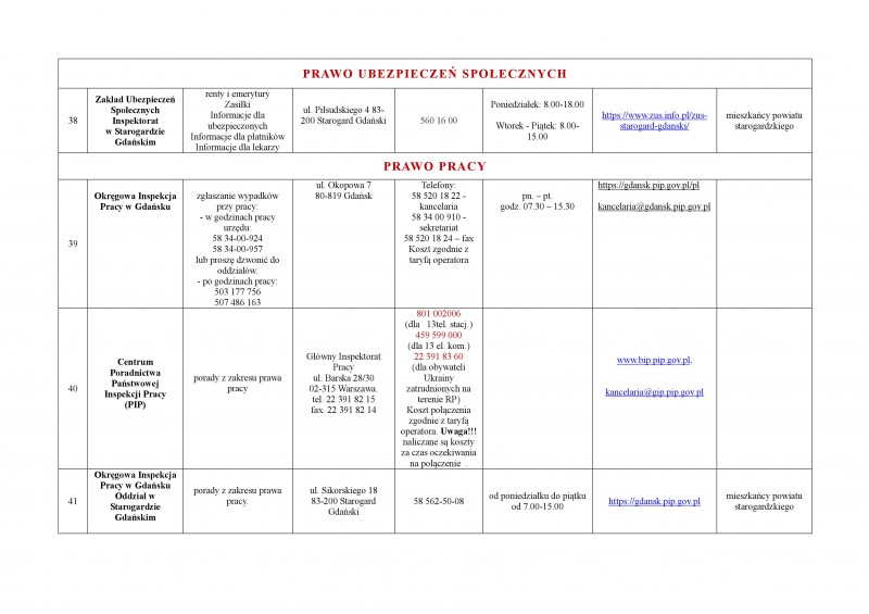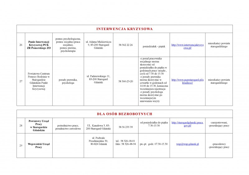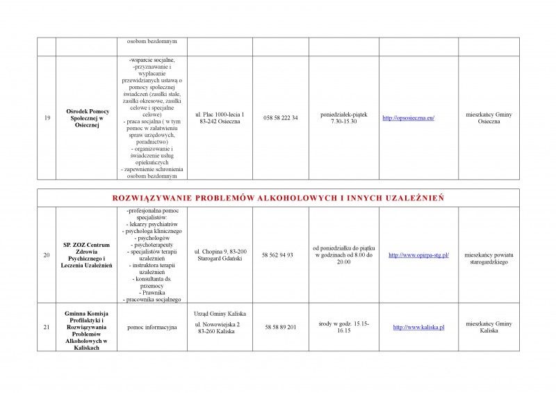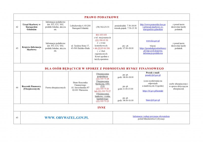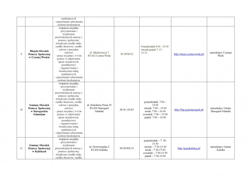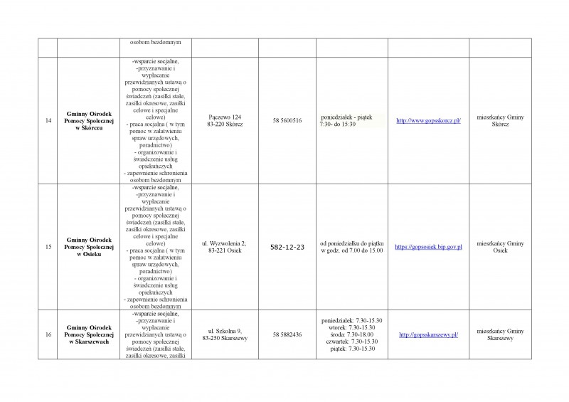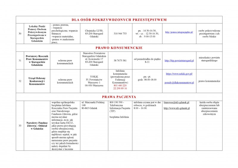- Skórcz – punkt prowadzony przez Stowarzyszenie OVUM z siedzibą w Gdyni, ul. Traugutta 2, 81-388 Gdynia. Nieodpłatne poradnictwo obywatelskie będzie udzielane przez adwokata. Kontakt tel. 58 350 15 15 (w godzinach od 12.00 do 20.00), www.ovum.org.pl