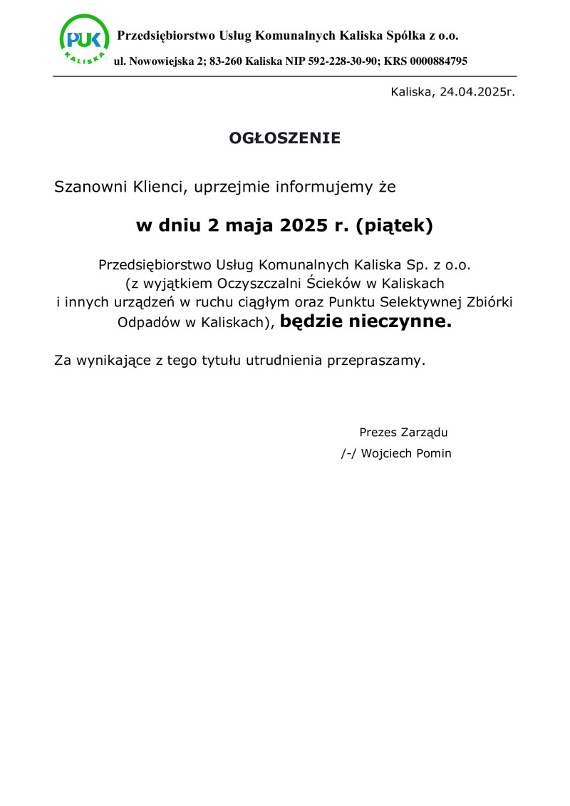 Przedsiębiorstwo Usług Komunalnych w dniu 02 maja 2025 r jest nieczynne