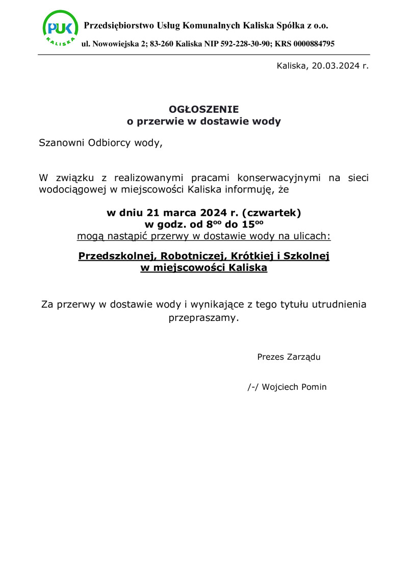 Przerwa w dostawie wody ul. Przedszkolna, Robotnicza, Krótka i Szkolna w miejscowości Kaliska