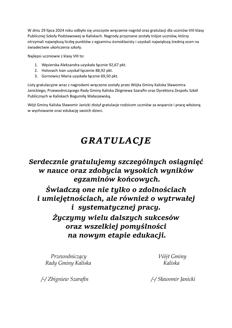 Uroczyste wręczenie nagród oraz gratulacji dla uczniów VIII klasy