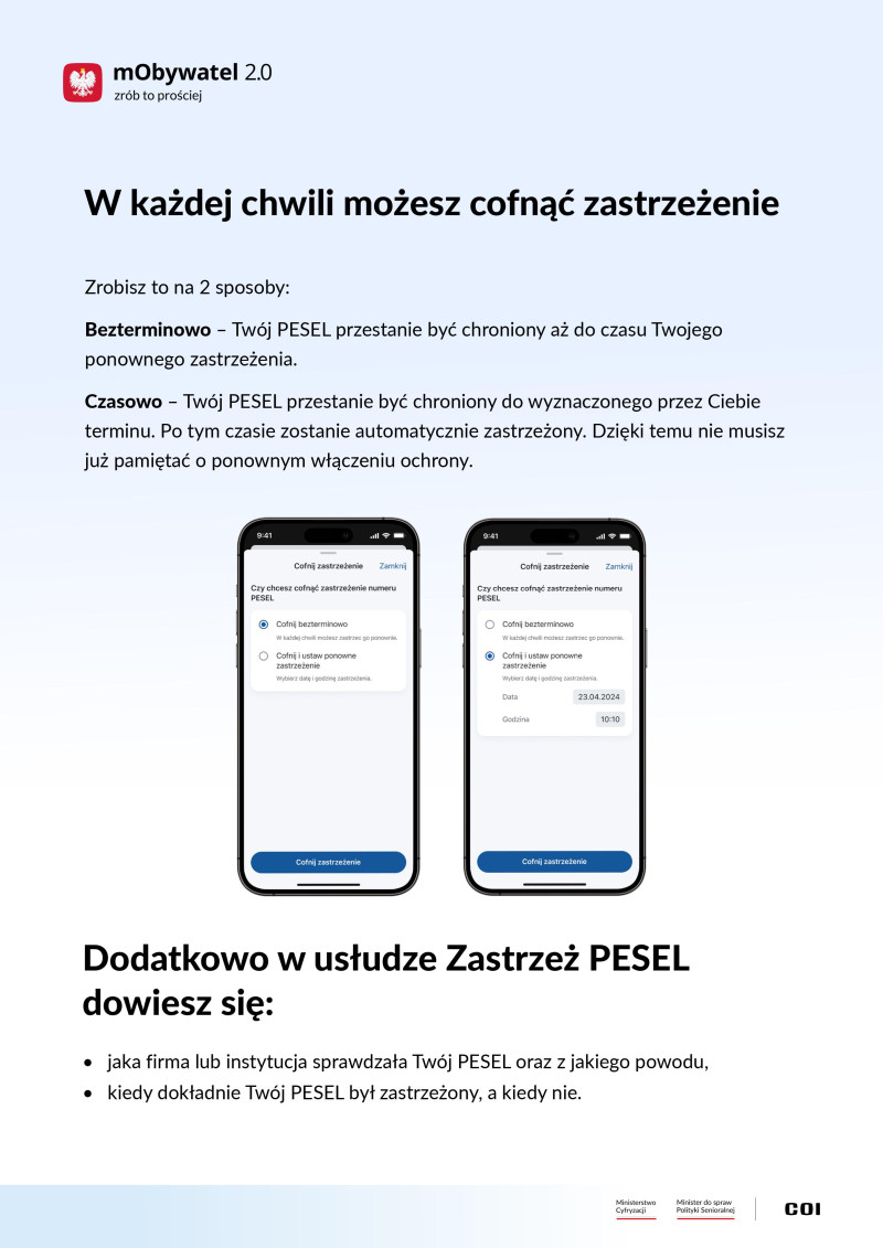 Więcej informacji o aplikacji i usłudze Zastrzeż PESEL znajdziesz na stronie www.info.mObywatel.gov.pl