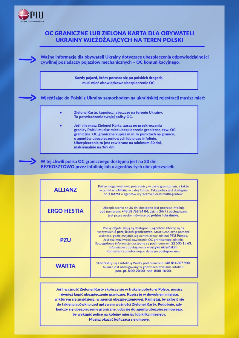 • Якщо у вас немає Зеленої карти, вам потрібна прикордонна страховка після перетину польського кордону. Прикордонне страхування на 30 днів для осіб, які в’їжджають з України, безкоштовне. Таке страхування пропонують Allianz, ERGO Hestia, PZU та Warta – страхування доступне у агентів цих компаній на прикордонних переходах або через гарячу лінію (Телефон).